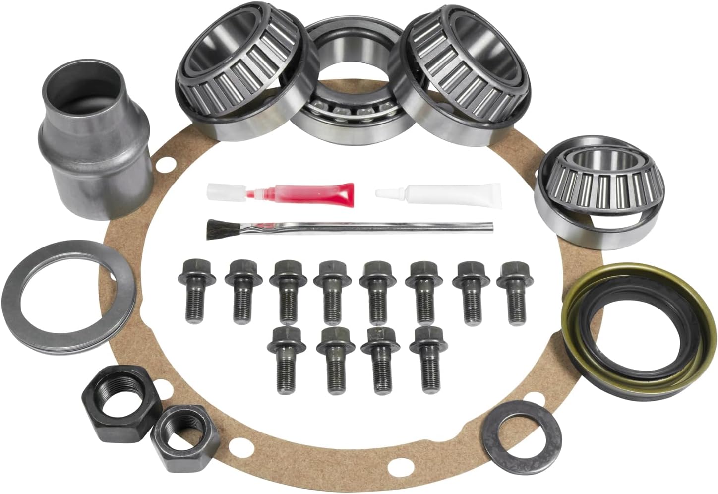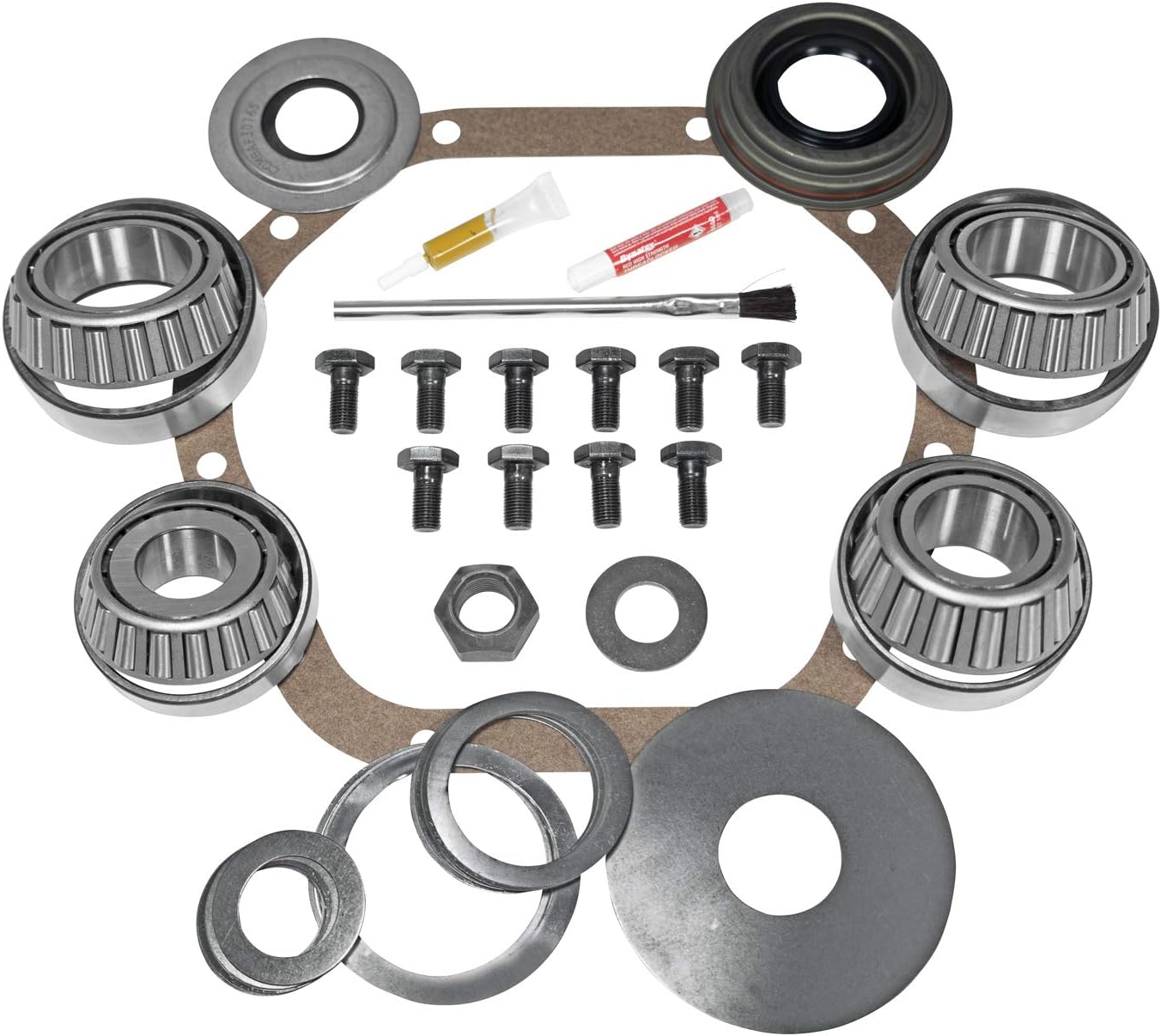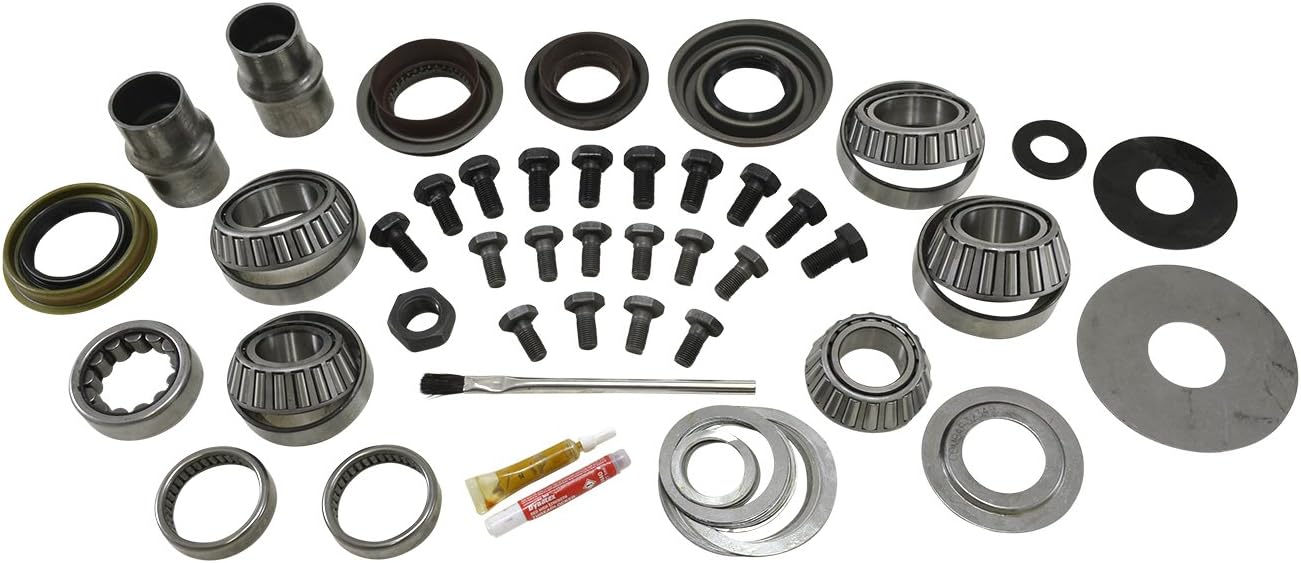A complete package for differential work. Included in the Yukon Master Overhaul Kit are carrier bearings and races, pinion bearings and races, pinion seal, axle seals, complete shim kit, ring gear bolts, pinion nut, crush sleeve , oil baffles and slingers (if applicable), thread locker, marking compound with brush, gasket (if applicable) and silicone (if applicable).